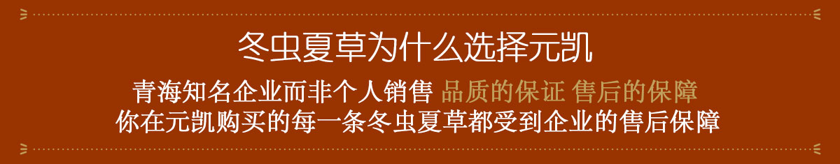 公司專業(yè)致力于青藏高原野生冬蟲夏草銷售、采收、精選包裝和現(xiàn)代化生產(chǎn)、研發(fā)等,并且在青海玉樹西藏那曲設(shè)立了采購站,專門采購地道的野生冬蟲夏草,充分保證了產(chǎn)品的品質(zhì)。元凱長期向國內(nèi)眾多著名藥材經(jīng)銷商、港澳臺以及東南亞中藥材采購商供應(yīng)冬蟲夏草,多次被省、市、縣授予多種榮譽稱號“青海省知名商標”、“青海省誠信單位”、“青海省名優(yōu)企業(yè)”、“守合同重信用企業(yè)”等。